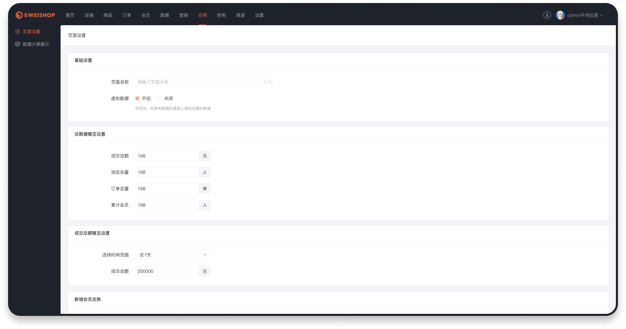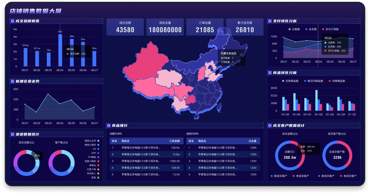 包含多个数据板块:成交总额概览、新增会员走势、渠道数据统计、商品排行、支付转化分析、商品转化分析、成交客户数据统计等。